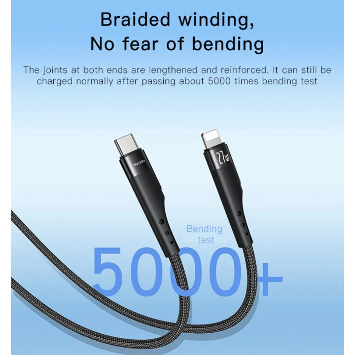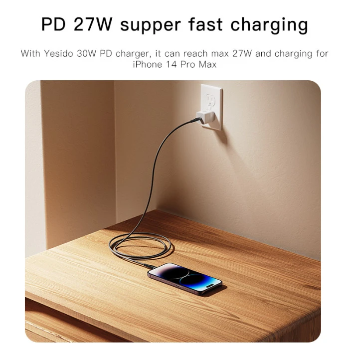 he YESIDO 27W PD Fast Charge USB-C to Lightning Cable offers fast and reliable charging and data transfer for your iPhone. With a length of 1 meter, this cable supports Power Delivery (PD) up to 27W, enabling quick charging to keep your device powered efficiently. It also supports high-speed data transmission, making it a versatile and durable accessory for everyday use.