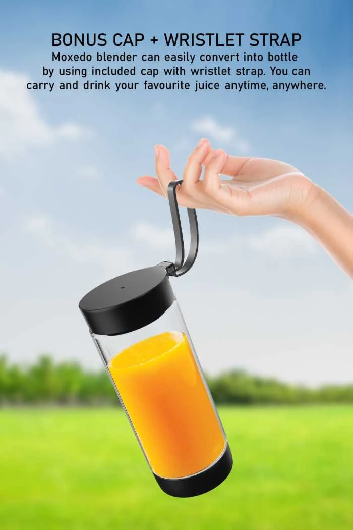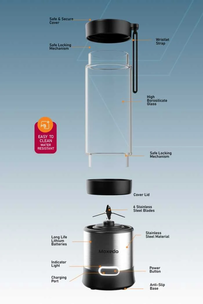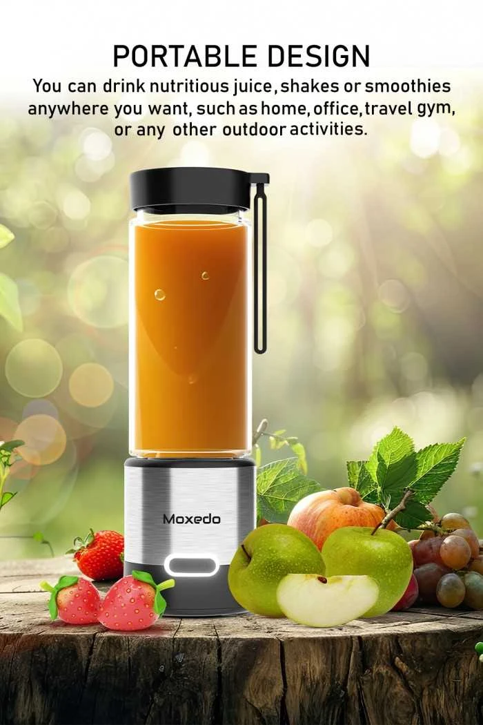 The Moxedo Frutiva Rechargeable Juice Blender is designed to bring power and convenience to your healthy lifestyle. Featuring a 16,500 RPM motor and six ultra-sharp stainless-steel blades, this portable blender delivers silky-smooth shakes, juices, and smoothies in seconds. With its USB rechargeable design, it’s perfect for travel, gym, or office use — offering up to 15 blending cycles per charge with a 3–5 hour recharge time. The self-cleaning function adds effortless maintenance: just add water, press start, and the blender cleans itself. Built from durable BPA-free materials, it ensures safe, long-lasting performance. Compact yet powerful, the Moxedo Frutiva combines a sleek design with practical functionality — a perfect companion for on-the-go blending.