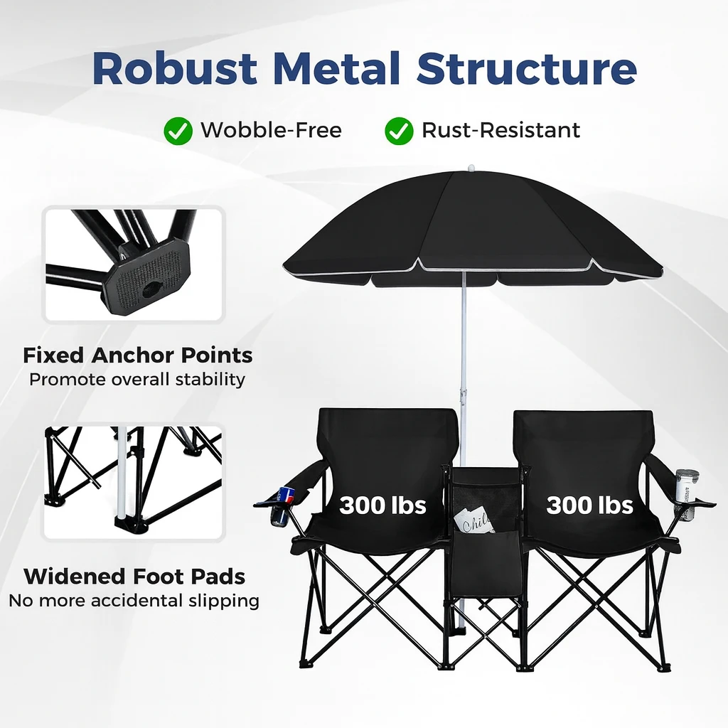 The Portable 2-Seat Folding Camping Chairs with Umbrella is the perfect setup for relaxing outdoors with a partner, friend, or family member. Designed with comfort and convenience in mind, this dual-chair design includes a built-in center table, cooler bag, beverage holders, and a handy side pocket. The adjustable and removable umbrella provides shade whenever needed, while the weather-resistant oxford fabric and strong steel frame ensure durability in outdoor environments. Easy to fold, store, and carry, this 2-seat chair set is ideal for beaches, parks, camping trips, backyard lounging, and picnics.