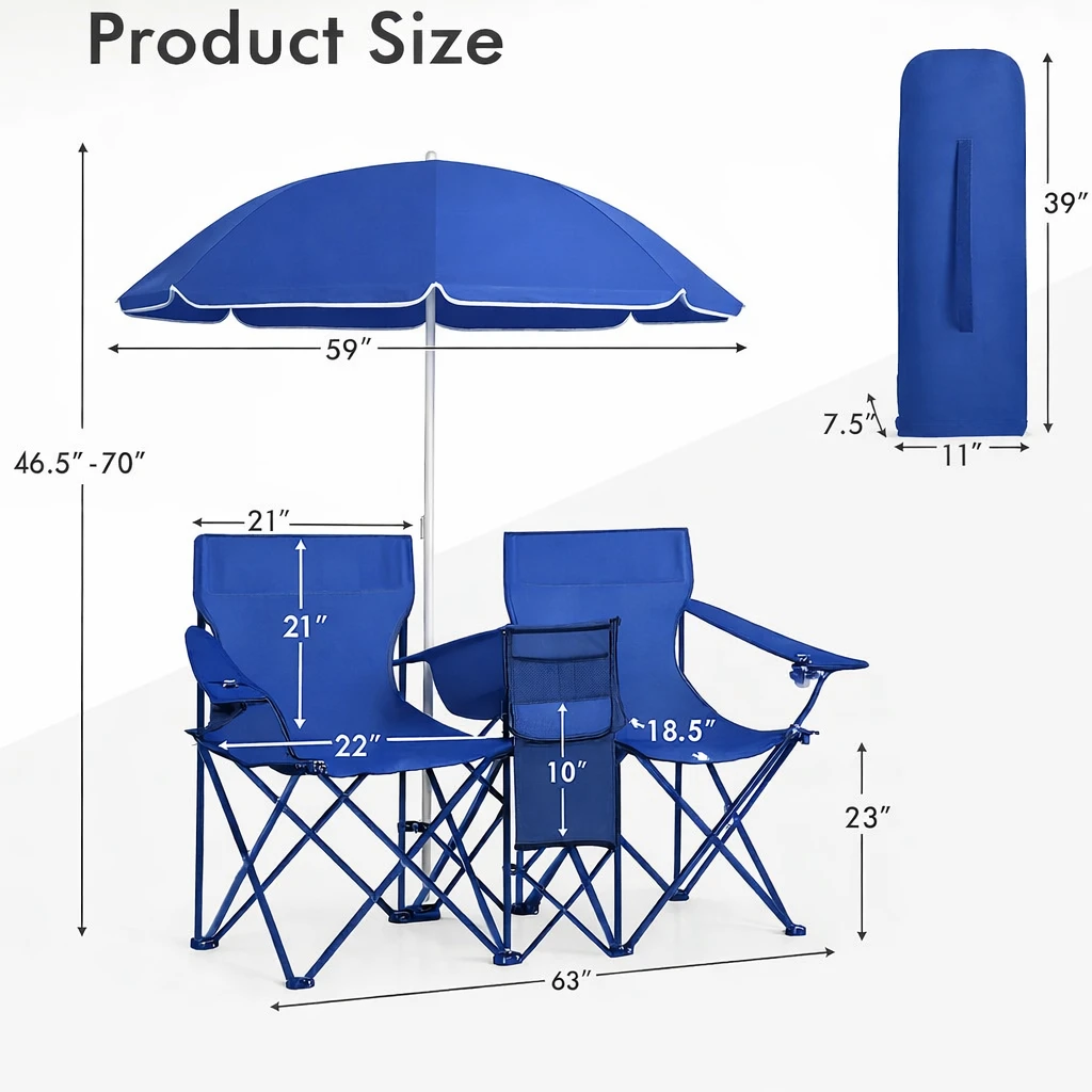 The Portable 2-Seat Folding Camping Chairs with Umbrella is the perfect setup for relaxing outdoors with a partner, friend, or family member. Designed with comfort and convenience in mind, this dual-chair design includes a built-in center table, cooler bag, beverage holders, and a handy side pocket. The adjustable and removable umbrella provides shade whenever needed, while the weather-resistant oxford fabric and strong steel frame ensure durability in outdoor environments. Easy to fold, store, and carry, this 2-seat chair set is ideal for beaches, parks, camping trips, backyard lounging, and picnics.