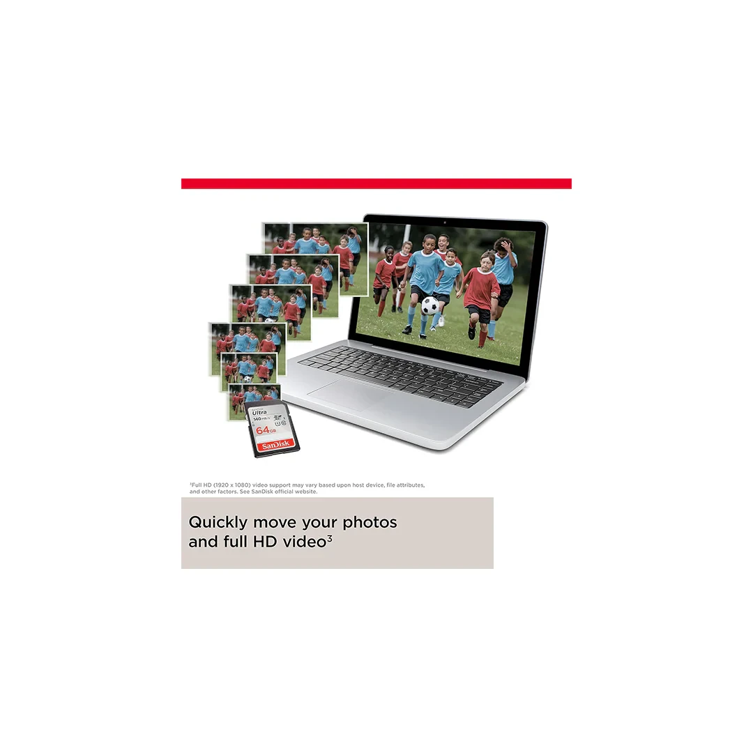 SanDisk Ultra 64GB SDXC UHS-I Card delivers smooth Full HD video and clear photo capture.