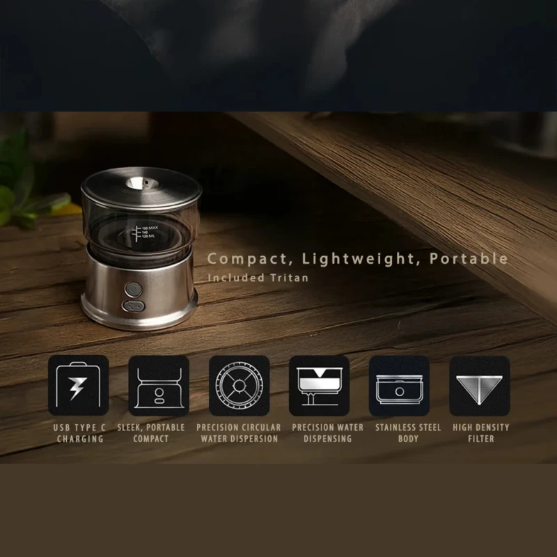 The MacDrip 2.0 is a portable, hand-brewed coffee maker designed for coffee enthusiasts on the move. Crafted from durable SUS304 stainless steel, it ensures longevity and resistance to rust and deformation. Weighing approximately 370 grams and measuring 100 x 100 x 101.55 mm, its compact and lightweight design makes it easy to store and carry, perfect for business trips or travel. The coffee maker features a 350ml capacity, suitable for brewing a satisfying cup of coffee. It operates with a 3.7V polymer battery (500mAh) and utilizes a USB-C charging port for convenient recharging. Included in the package are the MacDrip Coffee Maker, a coffee cup, a charging cable, and a user manual, providing all essentials for a seamless brewing experience.