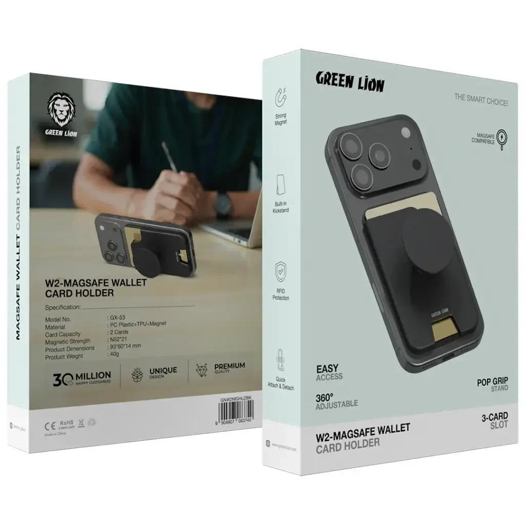 The Green Lion W2-MagSafe Wallet with Card Holder - Pop Stand Grip is a practical everyday accessory that keeps your essential cards close while adding extra grip and stand functionality to your phone. Built from durable TPU and PC, it uses strong N52 magnets to stay firmly attached to MagSafe-compatible devices, giving you a secure and stable hold. The wallet can store up to three cards in easy-access slots, keeping your most-used cards within reach without adding much bulk. The built-in pop grip stand offers 360° adjustability, working as both a comfortable hand grip and a kickstand for hands-free viewing at different angles. With RFID protection to help guard against digital theft and a quick attach/detach design, this MagSafe wallet is a smart blend of security, comfort, and everyday convenience.