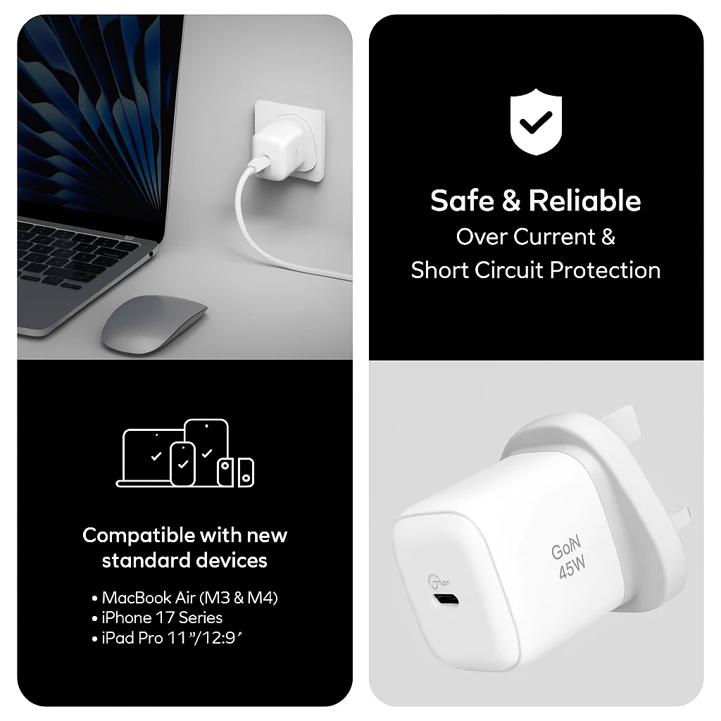 • 45W GaN Technology: High-speed, efficient charging in a compact design.