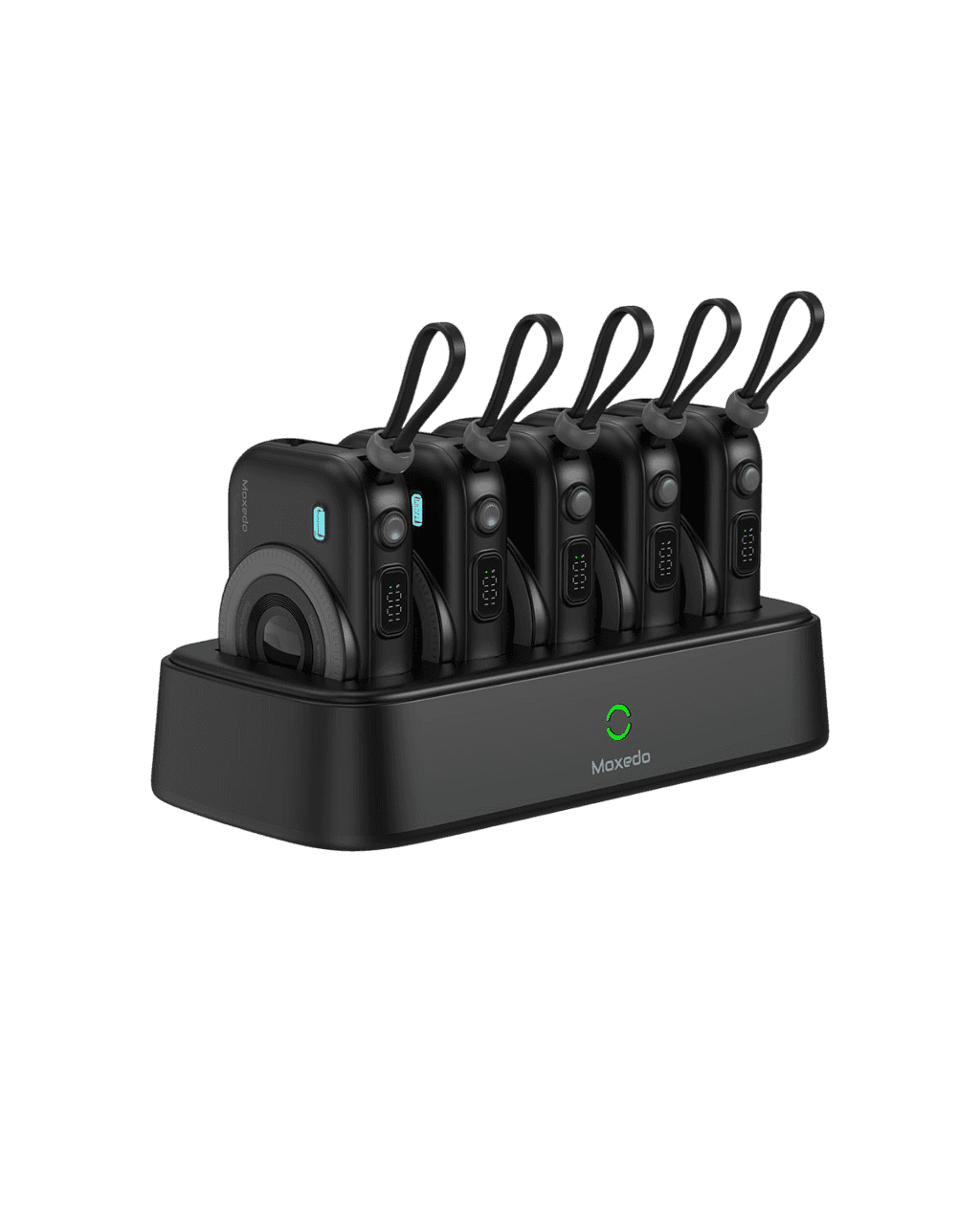 Experience ultimate charging convenience with the Moxedo 5-in-1 Combo Power Bank Kit. This all-in-one power solution includes five compact 10,000mAh power banks, each equipped with 22.5W USB-C Power Delivery, built-in USB-C and Lightning cables, and a wireless charging feature. Housed in a sleek charging dock, all five power banks can be charged simultaneously, making this the perfect solution for families, teams, or tech-savvy users on the go. Key Features: 5-in-1 Power Bank Kit: Includes five 10,000mAh power banks with a smart charging dock Built-in USB-C & Lightning Cables: No need to carry extra cables—ready to charge iOS and Android devices22.5W USB-C Fast Charging: Delivers rapid, efficient power to your devices Wireless Charging Support: Charge wirelessly for added convenience Smart Charging Dock: Charges all five power banks at once; includes USB-C input/output Advanced Safety Features: Multi-protect system against over-charging, overheating, and short-circuits LED Display: Digital battery indicator on each unit for easy monitoring Ideal for both personal and shared use, the Moxedo PBH039 is the ultimate power companion for busy lifestyles, ensuring your devices stay charged anytime, anywhere.