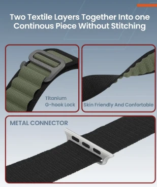 The Moxedo Alpine Loop Watch Band offers a rugged and comfortable design, crafted from two textile layers woven seamlessly into a single piece without stitching. It features a premium, corrosion-resistant Titanium G-Hook and metal connectors, ensuring a secure fit during various activities. Compatible with a range of Apple Watch sizes 44mm,45mm and 49mm.