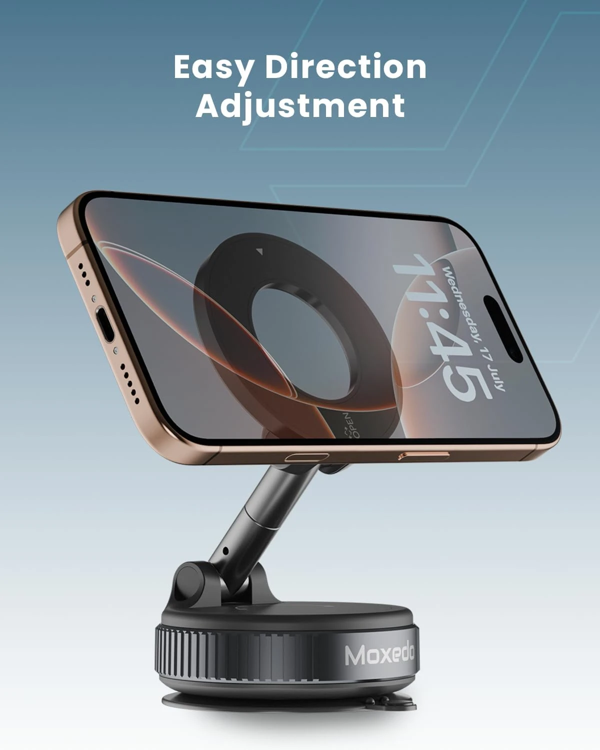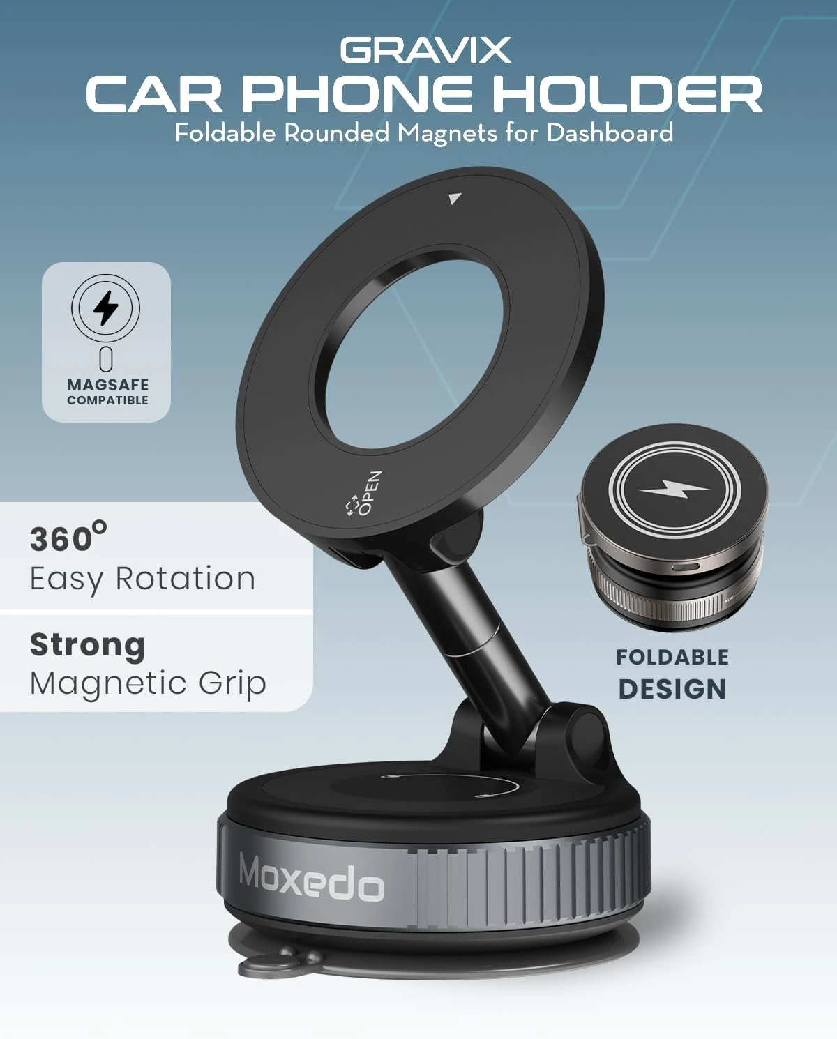 Upgrade your driving experience with the Moxedo Gravix, a foldable MagSafe car phone holder built for stability and convenience. Featuring a durable suction cup with a secure grip, it attaches firmly to dashboards, mirrors, or smooth surfaces — staying steady even on bumpy roads and sharp turns. Dual N52-grade magnets provide a strong magnetic hold for MagSafe iPhones, Samsung, and other smartphones, ensuring your device stays in place. With its 360° adjustable swivel arm, you can set the perfect viewing angle, whether vertical or horizontal, for safe and hands-free driving.