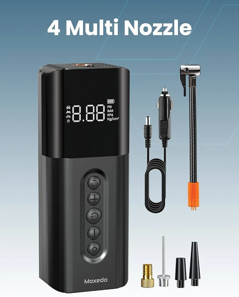 • LED LARGE SCREEN: Moxedo air dynamo portable air pump is equipped with a large LED screen, which is easy to read and observe the tire pressure status. The screen will display real-time tire pressure with bright numbers and automatically stop when the tire pressure reaches the preset value. This air pump is equipped with a precise pressure sensor that improves tire pressure detection accuracy to 150 PSI. It has 4 pressure units.
