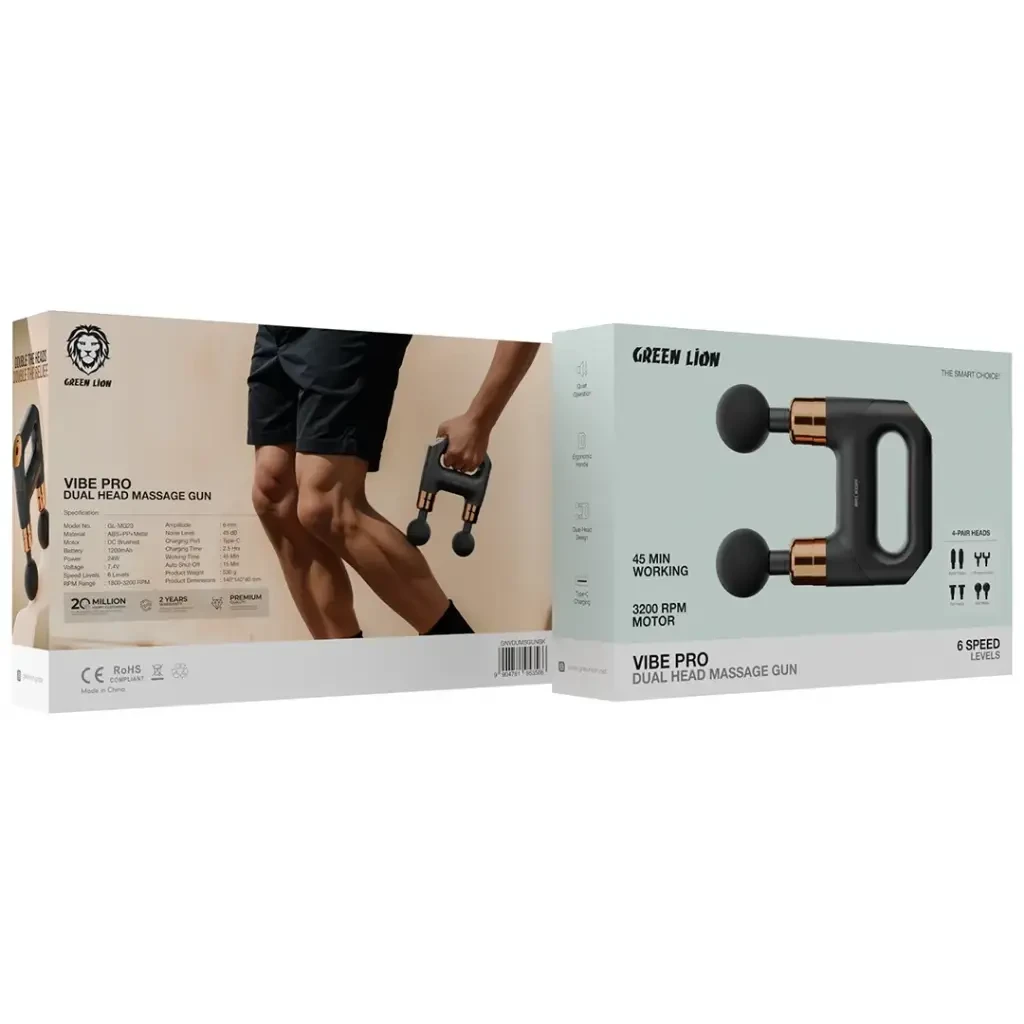 The Green Lion Vibe Pro Dual Head Massage Gun delivers powerful muscle relief and deep relaxation through its dual-head design, allowing you to target multiple areas at once for more effective recovery. Powered by a strong 24W motor with a 6mm amplitude, it offers 6 adjustable speed levels reaching up to 3200 RPM. Despite its strength, it operates quietly at just 45dB, ensuring a soothing and peaceful massage experience. The ergonomic handle provides a firm and comfortable grip, making long sessions easier. With a 1200mAh battery, you get up to 45 minutes of continuous use, and it recharges fully in 2.5 hours using a Type-C port. The device includes 4 interchangeable massage heads for different techniques and automatically powers off after 15 minutes for safe operation.