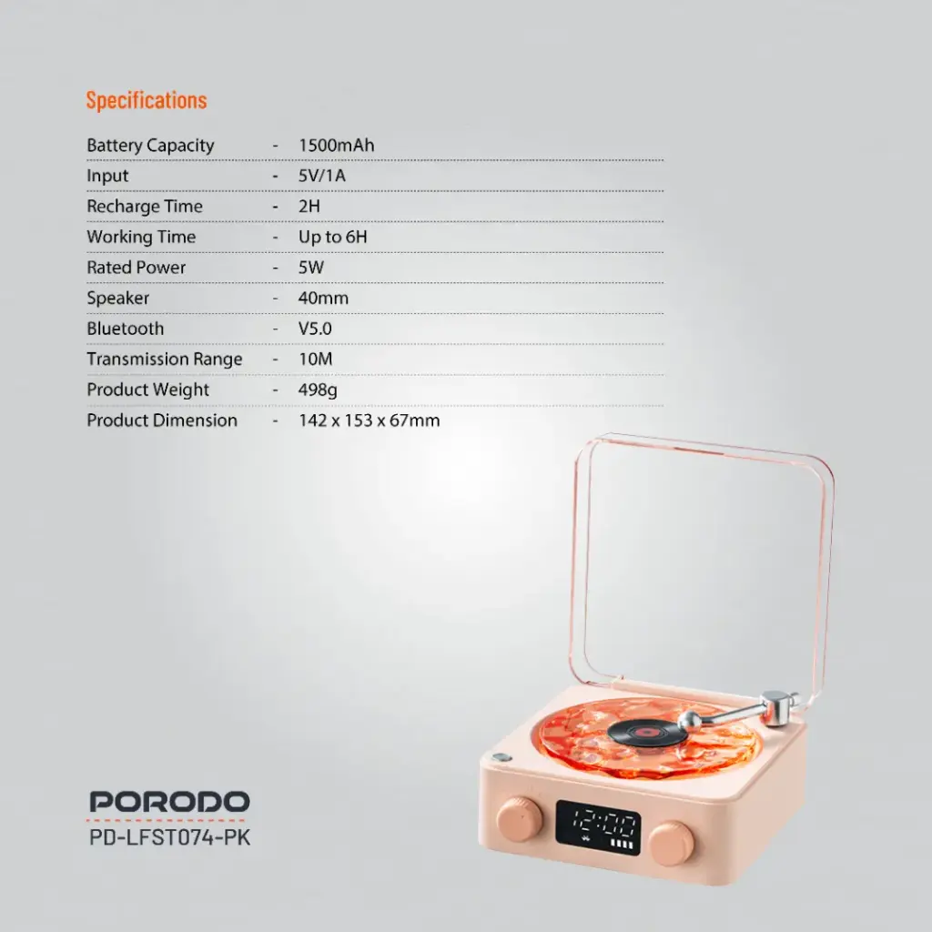 Porodo White Noise Portable Bluetooth Speaker with Clock Display (LFS074) Pink