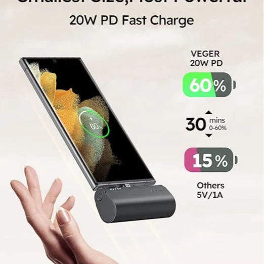 The Veger 5000mAh Ultra Compact Mini PowerBank with USB-C Connector is a sleek and portable charging solution designed to keep your devices powered throughout the day. Its compact design ensures easy portability, fitting comfortably into your pocket or bag.​ Key Features: High Capacity: With a 5000mAh capacity, this power bank provides ample charge to keep your devices operational during your daily activities.​ Fast Charging: Equipped with PD 20W fast charging technology, it delivers quick and efficient charging to your devices, minimizing downtime.​ Integrated USB-C Connector: Features a built-in USB-C connector, eliminating the need for additional cables and simplifying your charging setup.​ Compact and Portable: Measuring just 77mm in length and weighing only 92g, its mini size makes it easy to carry, ensuring your devices stay charged wherever you go.​ Universal Compatibility: Designed to work seamlessly with a wide range of devices, including smartphones, tablets, and other USB-C powered gadgets.​ Whether you're commuting, traveling, or simply on the move, the Veger 5000mAh Ultra Compact Mini PowerBank ensures your devices remain powered with ease and efficiency.