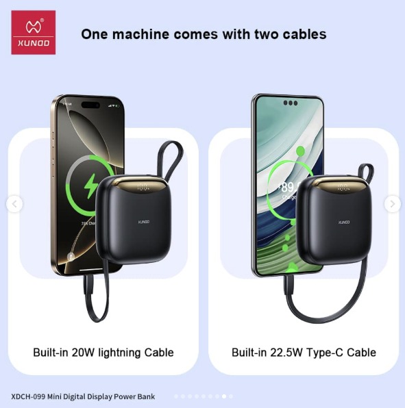 Compact, powerful, and designed for convenience, the XUNDD XDCH-99 Power Bank is your perfect on-the-go charging solution. With a high-capacity 10000mAh battery, smart digital display, and built-in fast charging cables, it delivers reliable energy and effortless portability wherever you go. Key Features: 10000mAh high-capacity battery Built-in dual fast charging cables (Type-C & Lightning) 22.5W fast charging output LED digital battery display Compact and travel-friendly design Multiple safety protections (temperature & overload control)