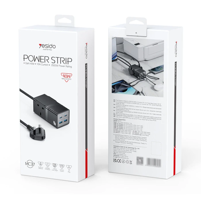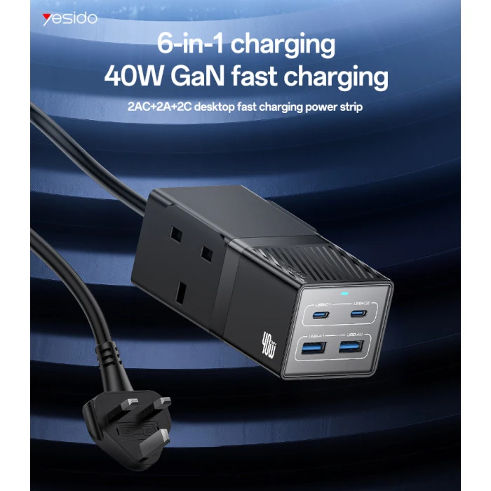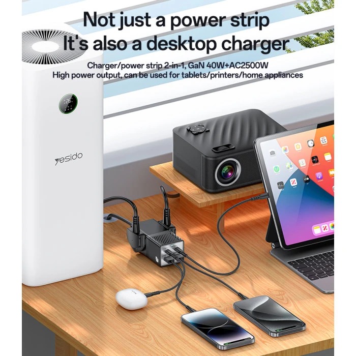 The Yesido 6-in-1 GaN Power Strip combines high-speed charging and powerful energy output in a compact design. With a total power rating of 2500W and advanced GaN technology, it can efficiently charge multiple devices including phones, tablets, and more. Equipped with EU pin input and made from durable ABS+PC material, it offers safe and reliable performance. The 1.5-meter cable ensures convenient placement, while its multiple ports support various power combinations for maximum flexibility.