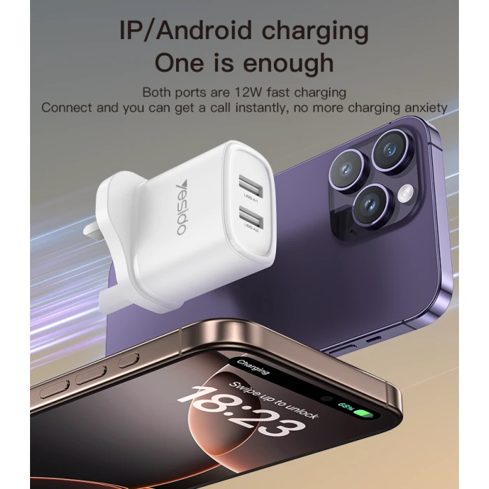 The Yesido YC91 Wall Charger is a compact and efficient charging solution featuring two USB-A ports, each supporting up to 12W fast charging. Designed with UK plug compatibility, it's suitable for charging mobile phones, tablets, and other devices. Constructed from ABS+PC materials, it ensures durability. With an input range of AC100-240V at 50/60Hz, the charger is versatile for international use.